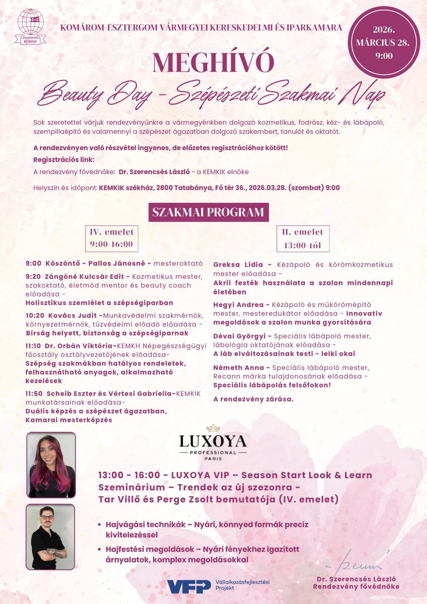 Sok szeretettel várjuk a Komárom-Esztergom Vármegyei Kereskedelmi és Iparkamara Szépészeti Szakmai Napjára a kozmetikus, fodrász, kéz- és lábápoló, szempillaépítő és valamennyi a szépészet ágazatban dolgozó szakembert, tanulót és oktatót.